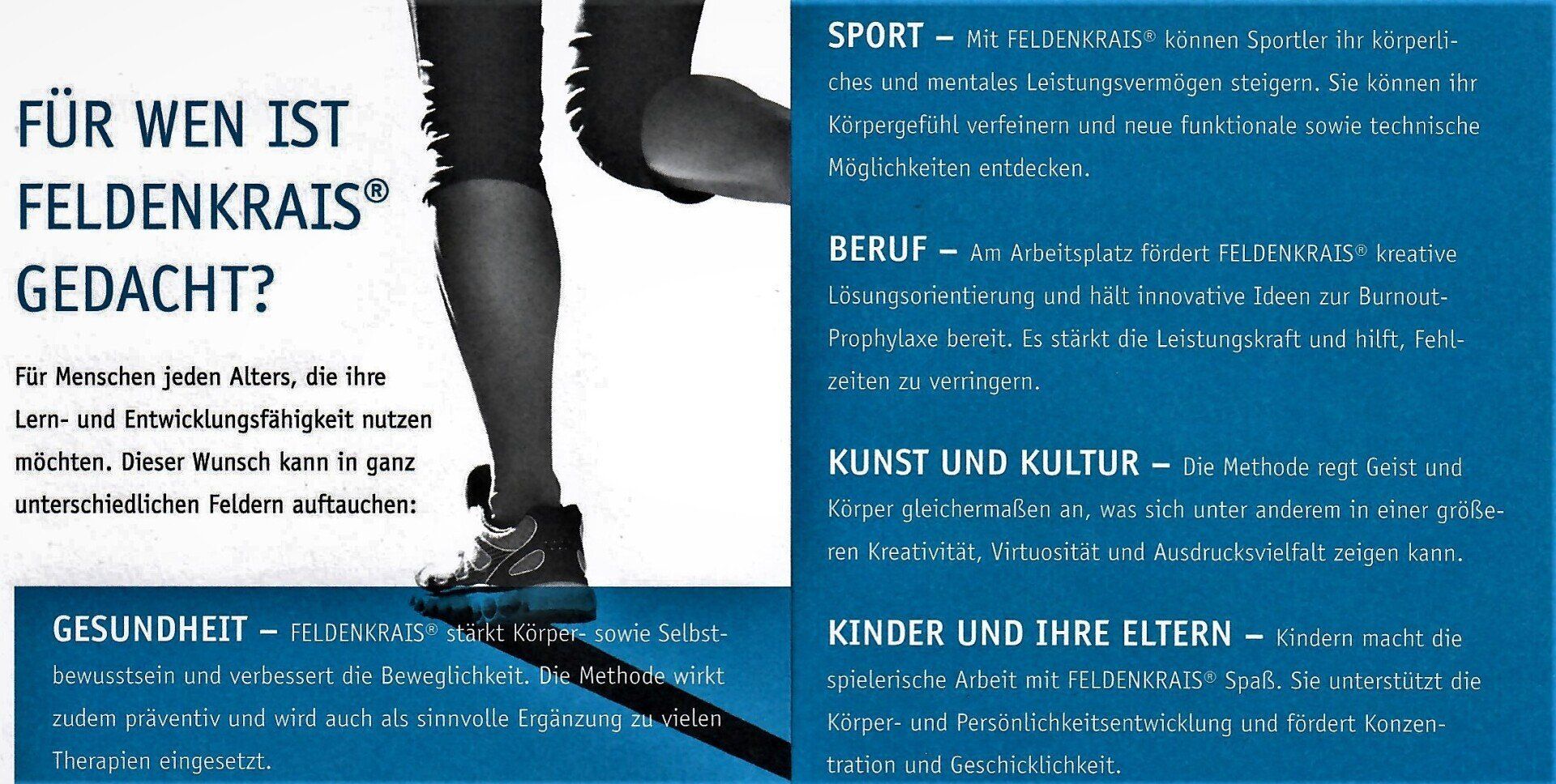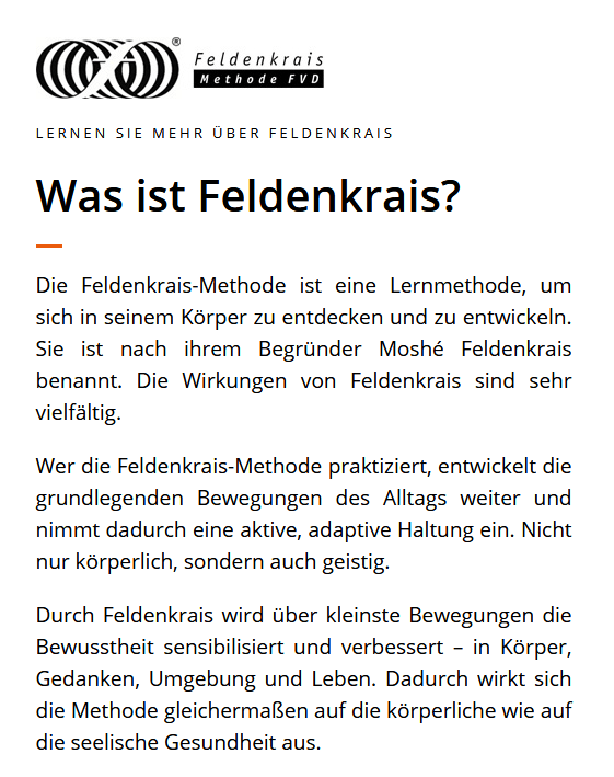 Menschen machen mit Feldenkrais® erstaunliche und ermutigende Erfahrungen. Begleitet und angeleitet durch mich finden Sie heraus, was in Ihnen und Ihrem Körper steckt und entdecken ungeahnte Möglichkeiten. Die Feldenkrais-Methode wirkt positiv auf Körper, Geist und Seele, indem sie den ganzen Menschen in Bewegung bringt.